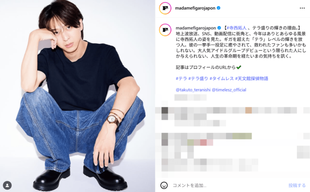 「カッコ良すぎて無理」timelesz寺西拓人、“前髪あり×デニム×ハイブラ”上品ビジュが沸騰「求めてたのこれ」 ピンズバNEWS編集部 2025.12.2 アーティスト エンタメ その他イケメン (2/2ページ) 1ページ目から読む ■【画像】「カッコ良すぎて無理」timelesz寺西拓人、“前髪あり×デニム×ハイブラ”上品ビジュ “前髪あり×デニム×ハイブラ”上品ビジュが《カッコ良すぎて無理》《求めてたのこれ》と沸騰中のtimelesz寺西拓人。初の主演映画では、一体どんな演技を見せてくれるのだろうか。 ※画像は『FIGARO japon』の公式インスタグラムより、以下同 この投稿をInstagramで見る フィガロジャポン(@madamefigarojapon)がシェアした投稿 この画像の記事を読む 1 2