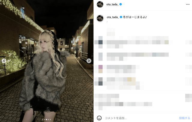 『夜ふかし』出演ではフェフ姉さんの相方として登場し、整形を公言するなど飾らない素顔で人気を集めている多田さん。今回公開したふわふわコート&ミニボトムの冬コーデには、《かわいすぎんだろ》といったコメントも。かわいいだけのコーデではなく、クールなテイストも感じられるのが多田さんらしい。