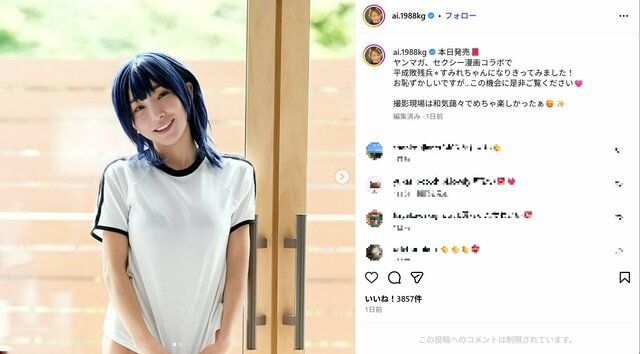 元モーニング娘。の加護亜依(37)が12月1日、インスタグラムを更新。『ヤングマガジン』と『ヤンマガWeb』で連載中の『平成敗残兵すみれちゃん』に登場する人気キャラクター、すしカルマ(御手洗颯子)に扮した姿を公開し、《か…カワイイ!》《相変わらず天使》などの声がファンから寄せられた。