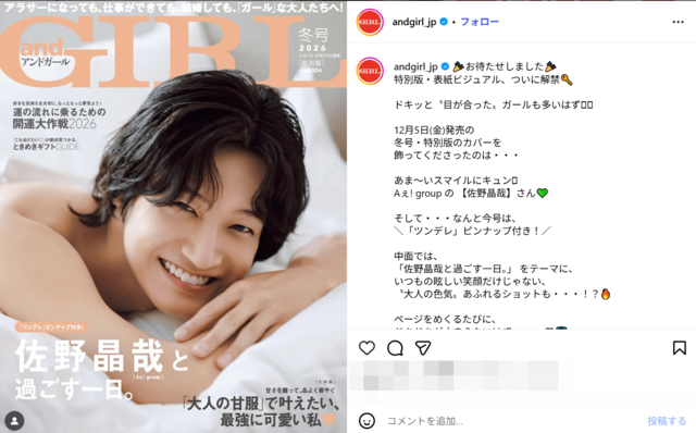 《えっと、とんでもない表紙ありがとうございます…》《合成かと思ったけど本物の表紙だったのね》との声も上がっているAぇ! group佐野晶哉のベッドショット。どんなシチュエーションでも、佐野のトレードマークともいえる笑顔が輝いている。