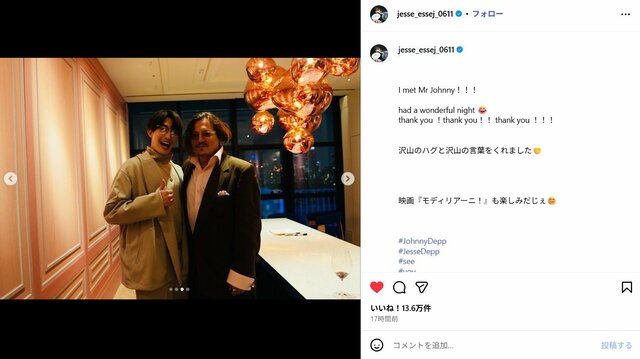 SixTONESのジェシーは、ハリウッドスターのジョニー・デップが来日した際、一緒に食事したことをインスタグラムで報告。とても“絵”になる2ショット写真には《映画のワンシーン?かと見間違う雰囲気ある写真 凄いねっ良かったね大変よくできました さっき新聞で来日を知ったからタイムリーで嬉しい報告ありがとうじぇす》《ジョニー・デップさんもジェシーくんも色気が凄い…なんだか親子みたい》といった声が多く寄せられている。