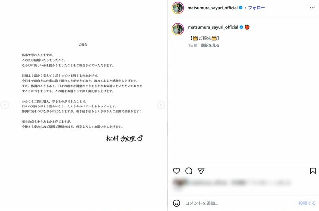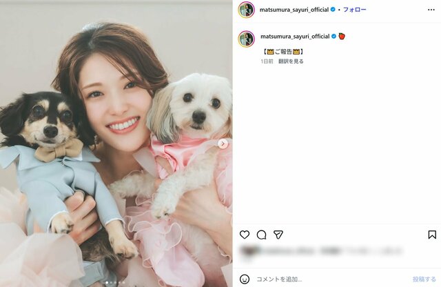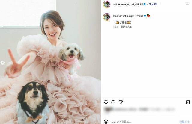 松村沙友理、「サンド富澤似」会社員と結婚&妊娠で好感度爆上がりで…「ママタレ界TOP2」に並ぶ日も ピンズバNEWS編集部 2025.12.7 テレビ&ラジオ 女優 女性アイドル (3/3ページ) 1ページ目から読む ■【画像】松村沙友理、会社員と結婚報告で魅せた“ゴージャスドレス姿&ハグショット” 元乃木坂46で“さゆりんご”の愛称で知られるタレントの松村沙友理が12月3日、会社員の一般男性との結婚と妊娠していることを発表。インスタグラムではゴージャスなドレスを着用し、愛犬をハグするショットを披露した。 ※画像は松村沙友理の公式インスタグラムより、以下同 この画像の記事を読む 1 2 3