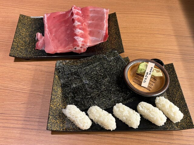 『生本まぐろ中落ちセット』(1480円)では、実際に生わさびをすりおろしたり、中落ちを骨から削ぐ工程を体験できる。自分で手巻き寿司のようにして、アトラクションのような面白さがあった。