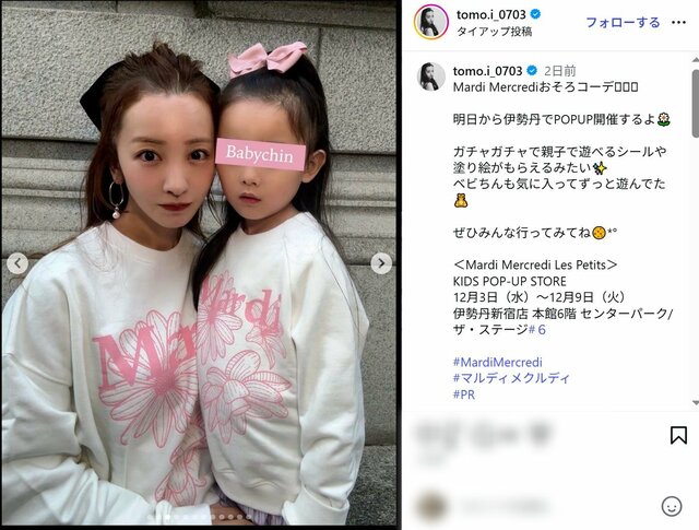 ■【画像】「初代神7」34歳タレント、「おでこの形がソックリ」愛娘とのおそろいコーデ&夫顔出しショット