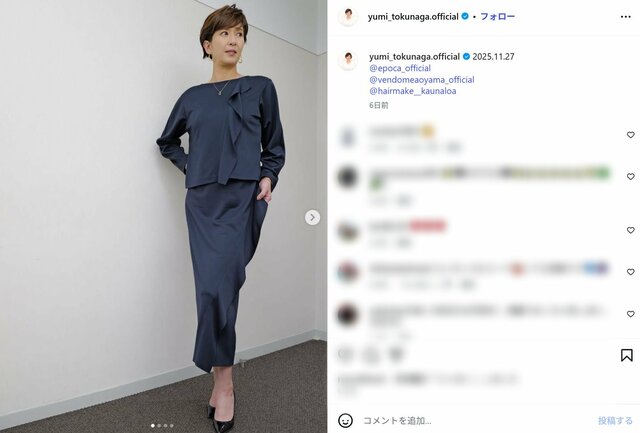 ウッチャンナンチャン・内村光良の妻で元テレビ朝日アナウンサーの徳永有美は『報道ステーション』(テレビ朝日系)に金曜MCとして出演中。インスタでは衣装を紹介しており、モデルポーズも披露。《エレガンスなコーデ とても素敵です》《綺麗でめっちゃ色っぽい、大好き》などのコメントが寄せられた。