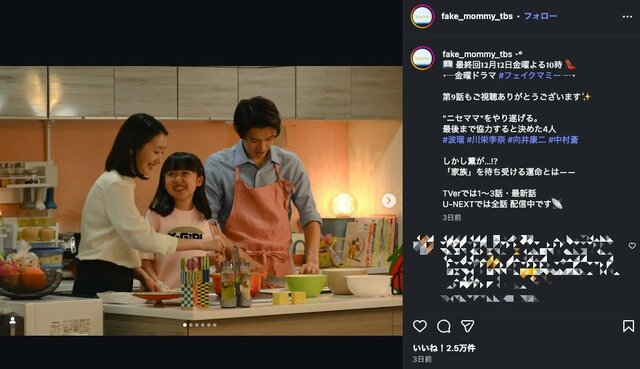 波瑠に川栄李奈、天才子役・池村蒼彩の力技で勝利、『フェイクマミー』ありえない設定なのに引き込まれてしまう超絶演技で見事にテレ朝『キントリ』超え ドラマライター・ヤマカワ 2025.12.12 テレビドラマ (3/3ページ) 1ページ目から読む ■【画像】波瑠と向井康二、“微笑ましい親子”子役の池村蒼彩を囲んだ3ショットを視聴者絶賛 薫・波瑠と竜馬・向井康二の関係も気になる! ※画像は『フェイクマミー』公式インスタグラムアカウントより ■TBS『フェイクマミー』公式サイト この画像の記事を読む 1 2 3