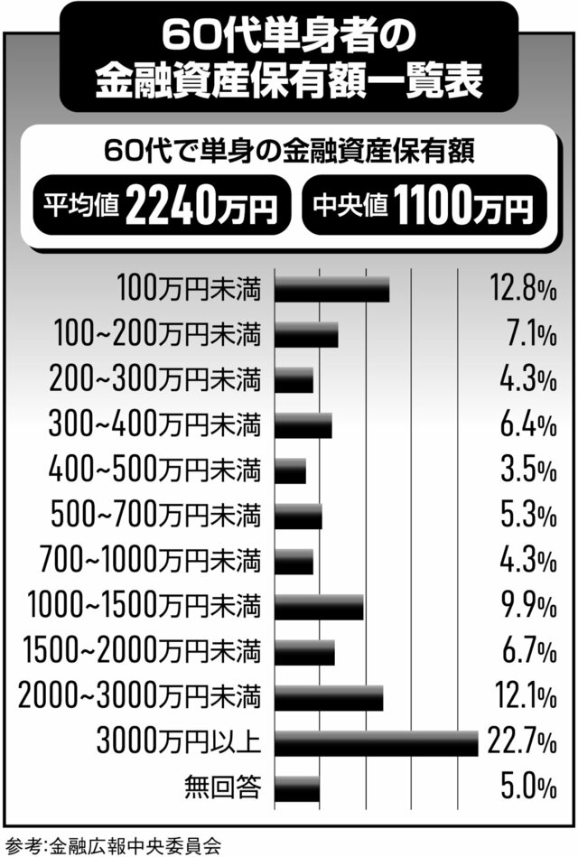 単身者に本当に必要な「老後資金」は490万円だった 金融庁発表の「夫婦で2000万円」はもはや古い ピンズバNEWS編集部 2025.12.11 マネー ライフ (3/3ページ) 1ページ目から読む ■【画像】60代単身者の金融資産保有額の平均値と中央値はこれくらい 60代で単身の場合、金融資産保有額の平均値は2240万円だが、中央値でみると1100万円になる。 60代単身者の金融資産保有額一覧表(本サイト作成) この画像の記事を読む 1 2 3