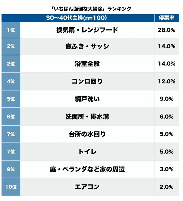 高いところにあり、構造が複雑なうえ、がんこな油汚れなどが多いため、圧倒的なトップに選ばれた。張るタイプのシートやフィルターなどもあるが、こまめに替えても全ての油汚れが防げるわけではない。専用の洗剤を使うのはもちろん、油汚れは重曹のスプレーや重曹をといた水に漬け置きすると落ちやすくできる。