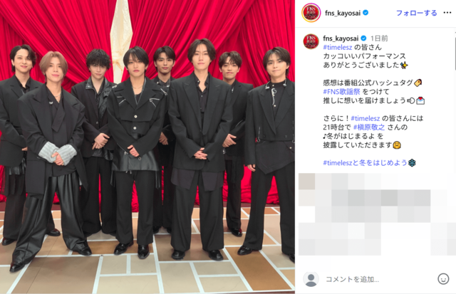「みんなビジュ大爆発」timelesz、“8人連名謝罪”を経て…渾身の黒衣装パフォーマンスが「過去一」沸騰 ピンズバNEWS編集部 2025.12.12 アーティスト エンタメ その他イケメン (2/2ページ) 1ページ目から読む ■【画像】「みんなビジュ大爆発」timelesz、“8人連名謝罪”を経て…渾身の黒衣装姿 “8人連名謝罪”を経た渾身パフォーマンスが《みんなビジュ大爆発》《過去一》と沸騰中のtimelesz。26年もこのままの勢いで駆け抜けてほしい。 ※画像は『FNS歌謡祭』の公式インスタグラムより この画像の記事を読む 1 2
