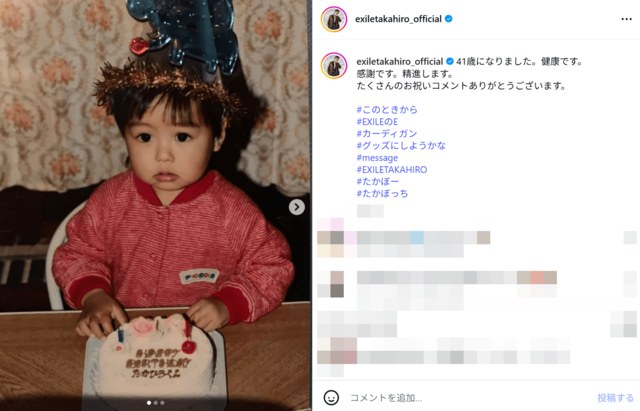 EXILE・TAKAHIRO、誕生日報告での黒目ぱっちり幼少期ショットに「小さい時からイケメン」「ほっぺがたまらない」 ピンズバNEWS編集部 2025.12.15 アーティスト エンタメ (2/2ページ) 1ページ目から読む ■【画像】「可愛いーほっぺがたまらない」TAKAHIRO、黒目ぱっちり幼少期ショット 41歳の誕生日報告とともに公開されたTAKAHIROの幼少期ショット。《可愛いーほっぺがたまらない》という声があがっていたが、《小さい時からイケメン》ということも証明されたようだ。 ※画像はTAKAHIROのインスタグラムより この画像の記事を読む 1 2