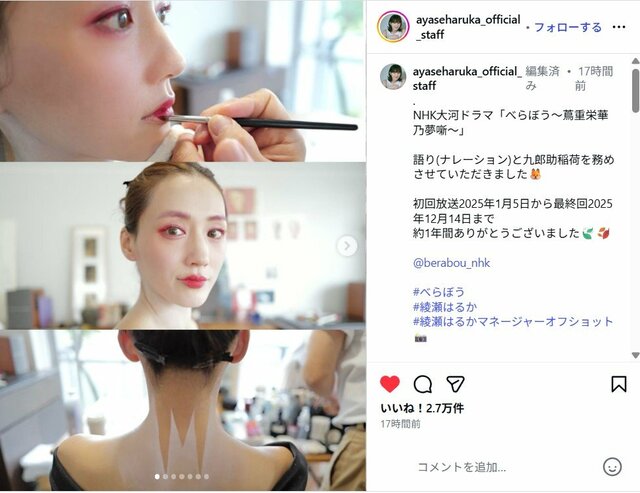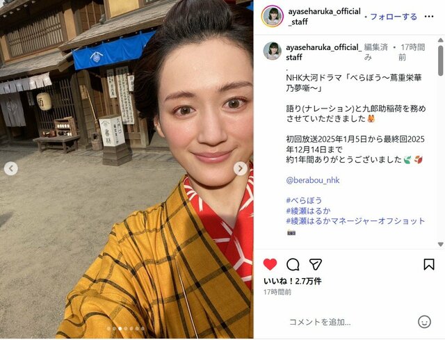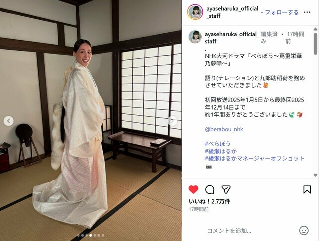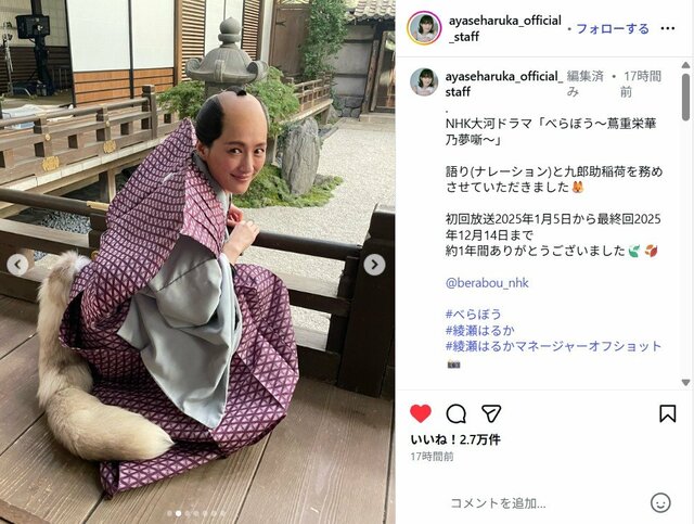 『べらぼう』にナレーション兼キツネの九郎助稲荷(くろすけいなり)という役で出演した綾瀬はるか。第1回では花魁、第17回では町娘や武士、そして最終回では巫女の姿で登場した。インスタグラムには、綾瀬が“花魁メイク”として白粉と紅化粧を施している様子、ちょんまげ姿で武士になり切っている姿などが投稿され、《ちょんまげが似合う女優 何してもかわいい》《和装が死ぬほど似合う女優》といった、絶賛する声が多く寄せられている。