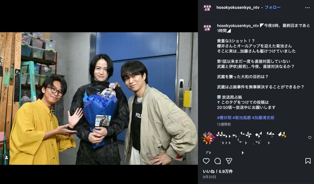櫻井翔ドラマはオワコン状態『放送局占拠』良かったのは最初だけ…偉大なるマンネリも視聴者が離れていったやりすぎ自己パロディ【2025後半ドラマ一大事】 ドラマライター・ヤマカワ 2025.12.27 テレビドラマ (3/3ページ) 1ページ目から読む ■【画像】櫻井翔・菊池風磨、加藤清史郎との貴重な3ショットに“赤ちゃんみたいな”満面の笑顔 菊池風磨(30)の再登場も効果がなかった……。 ※画像は『放送局占拠』公式インスタグラムアカウントより ■日本テレビ『放送局占拠』公式サイト この画像の記事を読む 1 2 3