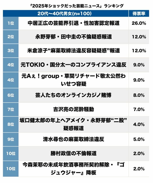 そして第1位(26.0%)は、中居正広氏の芸能界引退報道。