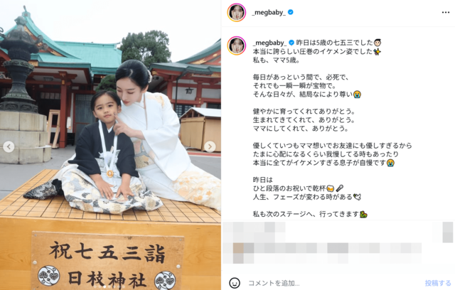 「こんな美男美女の親子見たことない」三代目JSBメンバーの元パートナー・MEGBABY、“自慢の息子”との七五三2ショ公開「本当に全てがイケメンすぎる」 ピンズバNEWS編集部 2025.12.18 エンタメ (2/2ページ) 1ページ目から読む ■【画像】「こんな美男美女の親子見たことない」MEGBABY、愛息のほっぺに優しく指を触れる七五三2ショット 《本当に全てがイケメンすぎる》と自慢の息子との七五三ショットを投稿したMEGBABYに、《こんな美男美女の親子見たことない》と驚きの声も。愛息の将来がとても楽しみだ。 ※画像はMEGBABYのインスタグラムより この画像の記事を読む 1 2