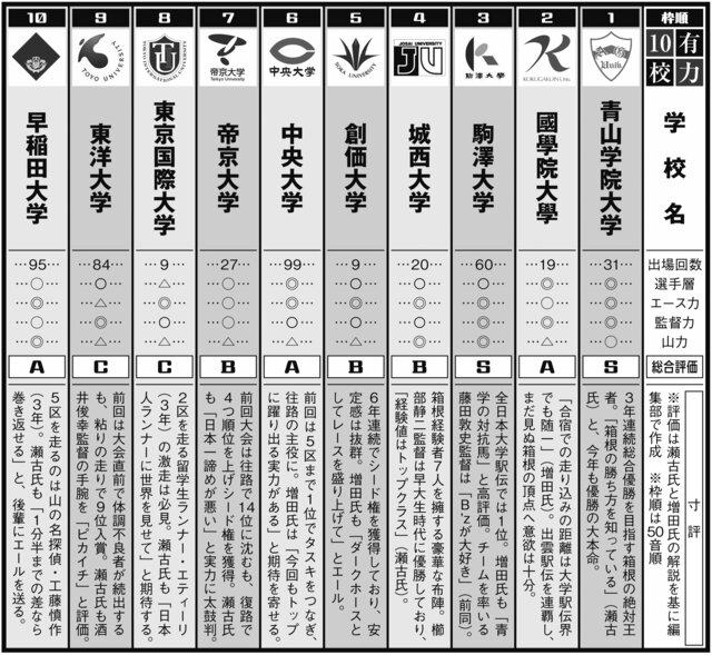 山の名探偵、早大・工藤慎作選手も語る「第102回箱根駅伝」見どころガイド 瀬古利彦&増田明美がレース解説 ピンズバNEWS編集部 2025.12.20 その他スポーツ (3/3ページ) 1ページ目から読む ■【画像】瀬古利彦&増田明美がレース解説!箱根駅伝出場校戦力分析 3連覇を目指す青山学院大学と前回2位の駒澤大学を中心に第102回大会となる箱根駅伝は展開されると見られている。 ※作成/編集部 この画像の記事を読む 1 2 3