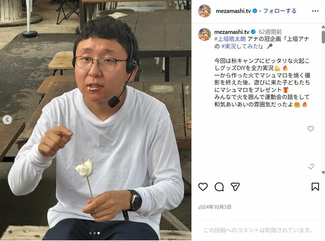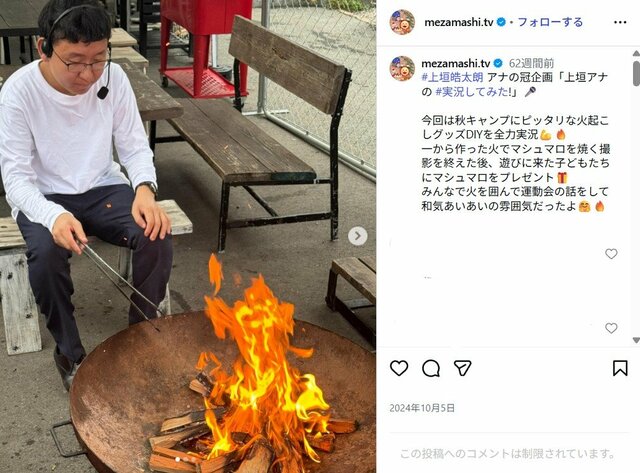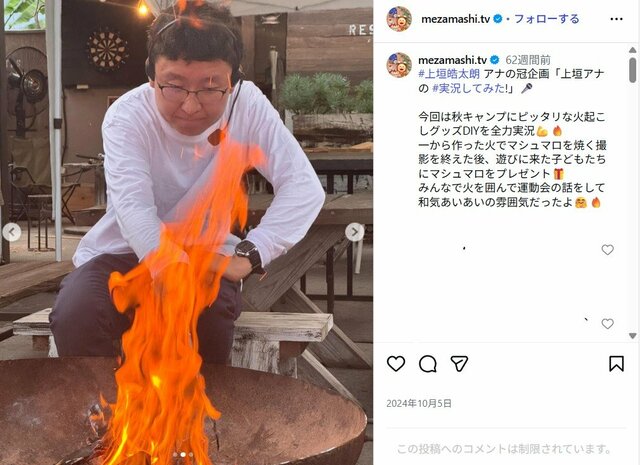 “未来の軽部真一アナウンサー”の期待がかかる、フジテレビの上垣皓太朗アナウンサー(24)。番組の企画で火起こしをしてマシュマロを食べる姿には、《一枚目の炎、(※『鬼滅の刃』の)煉獄さん思い出すアニメっぽい》《サラリーマンの休日みたいなショットですね》《ベテランの風格》などの声が寄せられている。