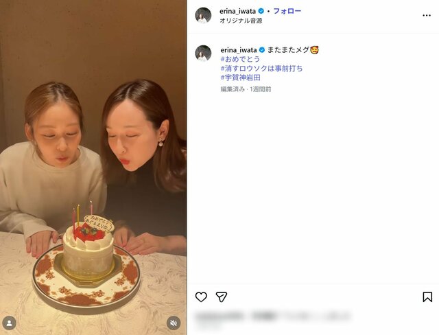 日本テレビからの退社が報じら得た岩田絵里奈アナは、局外のアナウンサーとの親交もあり、インスタグラムでは「好きな女性アナウンサーランキング」で10位にランクインしたTBSの宇賀神メグアナ(29)と一緒にケーキに刺さったロウソクの火を消す動画をアップしてファンを歓喜させた。