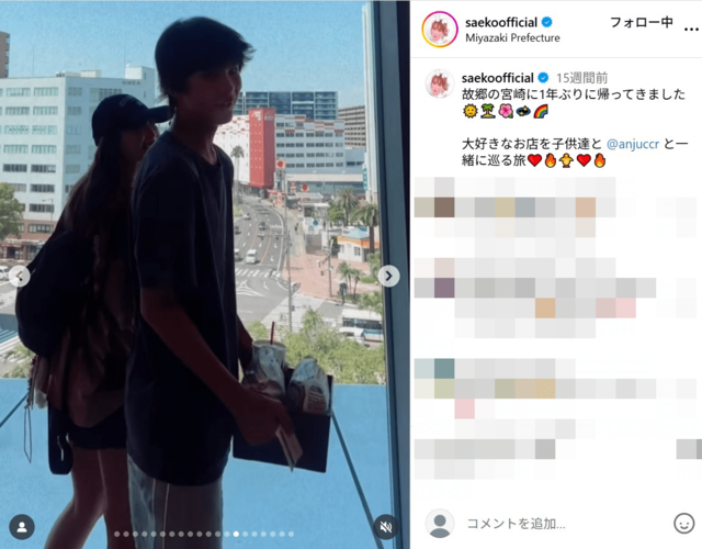 8月4日に紗栄子はインスタグラムで《故郷の宮崎に1年ぶりに帰ってきました》と地元への帰省を報告したが、投稿された写真や動画の中には、次男の後ろ姿や振り返った顔が一瞬映る場面があり、フォロワーからの注目を集めた。