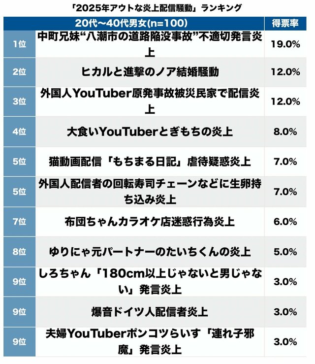 そして第1位(19.0%)は、中町兄妹“八潮市の道路陥没事故”不適切発言炎上。