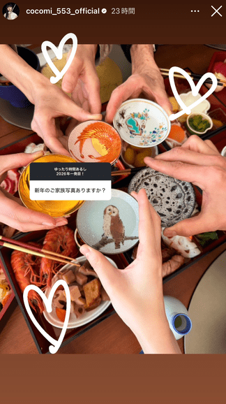 キムタク一家の新年初“家族集合写真”と豪華なおせち、さらに“新しい家族”であるビビことビジュちゃんの最新ニッコリ笑顔写真を公開し、ファンを喜ばせたCocomi。手元だけのショットでも十分貴重ではあるが、顔出しバージョンにも期待したい。