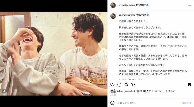 「本当にしんどくて…」timelesz松島聡、インスタに届く“心無い質問”に悲痛な訴え 投稿全削除していた真相を明かす ピンズバNEWS編集部 2026.1.7 ジャニーズ (2/2ページ) 1ページ目から読む ■【画像】「2026年もたくさん笑える一年にしたい」松島聡が公開した永山瑛太との笑顔ショット 8人組アイドルグループ・timeleszの松島聡(28)が1月3日、インスタグラムを更新し、新年のあいさつを行った。俳優の永山瑛太との2ショット写真を公開し、ファンを喜ばせている。 ※画像は松島聡のインスタグラムより この画像の記事を読む 1 2