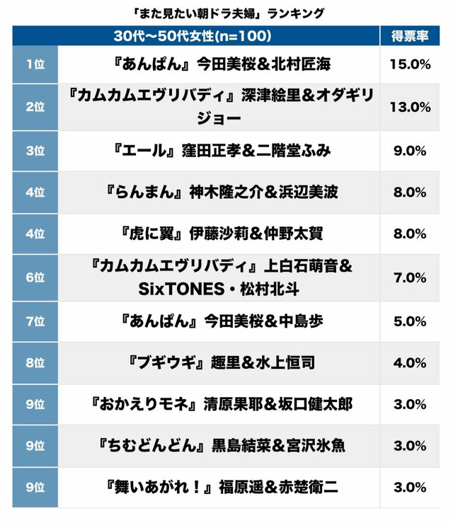 そして第1位(15.0%)は、『あんぱん』今田美桜&北村匠海。