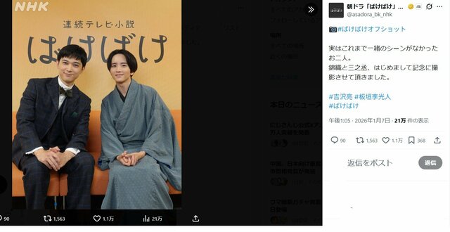 【ばけばけ】“共演多数”吉沢亮と板垣李光人の2ショットが大沸騰の中…“悪事発覚”板垣・三之丞が今後向かう悲しすぎる末路 ピンズバNEWS編集部 2026.1.8 テレビ&ラジオ エンタメ 俳優 (3/3ページ) 1ページ目から読む ■【画像】【ばけばけ】ファン大沸騰の“共演多数”吉沢亮と板垣李光人の2ショット 連続テレビ小説『ばけばけ』で共演中の吉沢亮と板垣李光人。2人はNHK大河ドラマ『青天を衝け』と映画『ババンババンバンバンパイア』でも共演していて、今回が3度目の共演。1月7日には、2人が同日放送の『ばけばけ』で、ついに同じ場面に登場したことを祝して、ドラマ公式Xが2人のツーショット写真を投稿した。 ※画像は『ばけばけ』公式Xより この画像の記事を読む 1 2 3