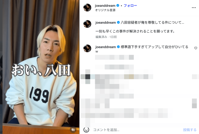 「もし見てんだったらDMしろ」登録者242万人超人気YouTuber、“尊敬されている”ひき逃げ事件容疑者へ真剣に呼びかけ ピンズバNEWS編集部 2026.1.8 エンタメ (2/2ページ) 1ページ目から読む ■【画像】ひき逃げ事件容疑者へ真剣に呼びかける登録者242万人超の人気YouTuber 八田容疑者に対して《もし見てんだったらDMしろ》《しっかり自首して、反省して罪を償え》と呼びかけたジョー。八田容疑者本人に届くだろうか。 ※画像はジョーブログのインスタグラムより この画像の記事を読む 1 2