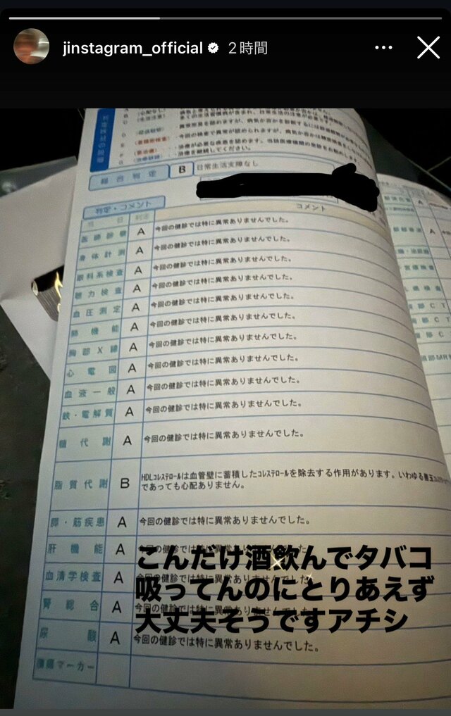 元KAT-TUNの赤西仁(41)が1月8日、インスタグラムのストーリーズを更新。《こんだけ酒飲んでタバコ吸ってんのにとりあえず大丈夫そうですアチシ》(原文ママ)と綴り、“ほぼオールA”だった健康診断の結果表を公開した。