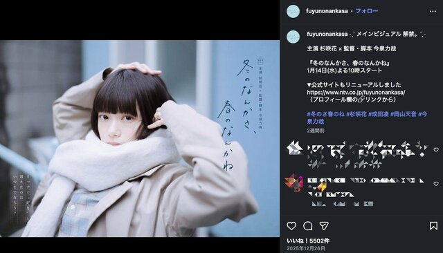 杉咲花『冬のなんかさ、春のなんかね』は目黒蓮『silent』を超えられるか “通好みドラマ”を確実に届ける演技おばけ・杉咲の力量とライバル不在の好条件 ドラマライター・ヤマカワ 2026.1.14 テレビドラマ (3/3ページ) 1ページ目から読む ■【画像】杉咲花「透明感すごすぎる」主演する『冬のさ春のね』の心が奪われるメインビジュ 日テレ水曜枠の救世主となるか? ※画像は『冬のなんかさ、春のなんかね』公式インスタグラムアカウントより ■日本テレビ『冬のなんかさ、春のなんかね』公式サイト この画像の記事を読む 1 2 3
