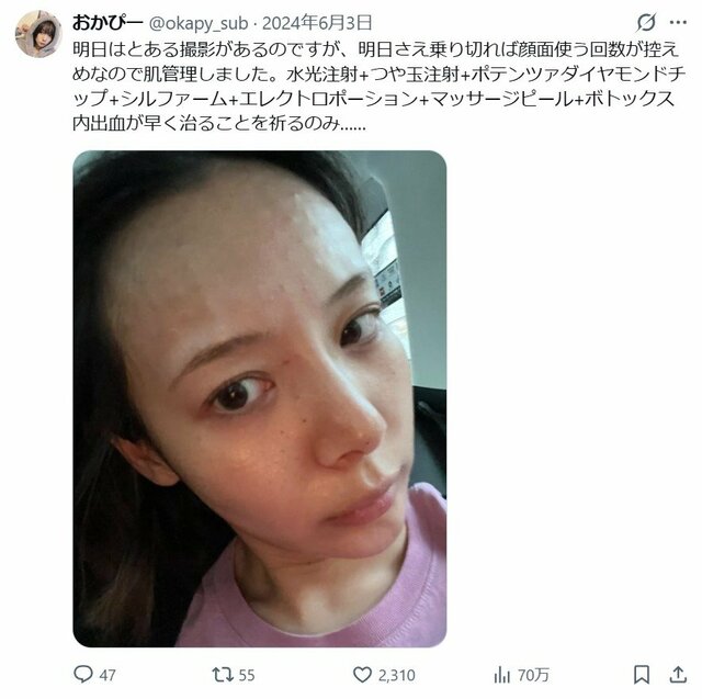 ■【画像】「顔に傷つけちゃダメだょ」岡田紗佳が美容施術後の“おでこボコボコ”すっぴんショットを堂々公開