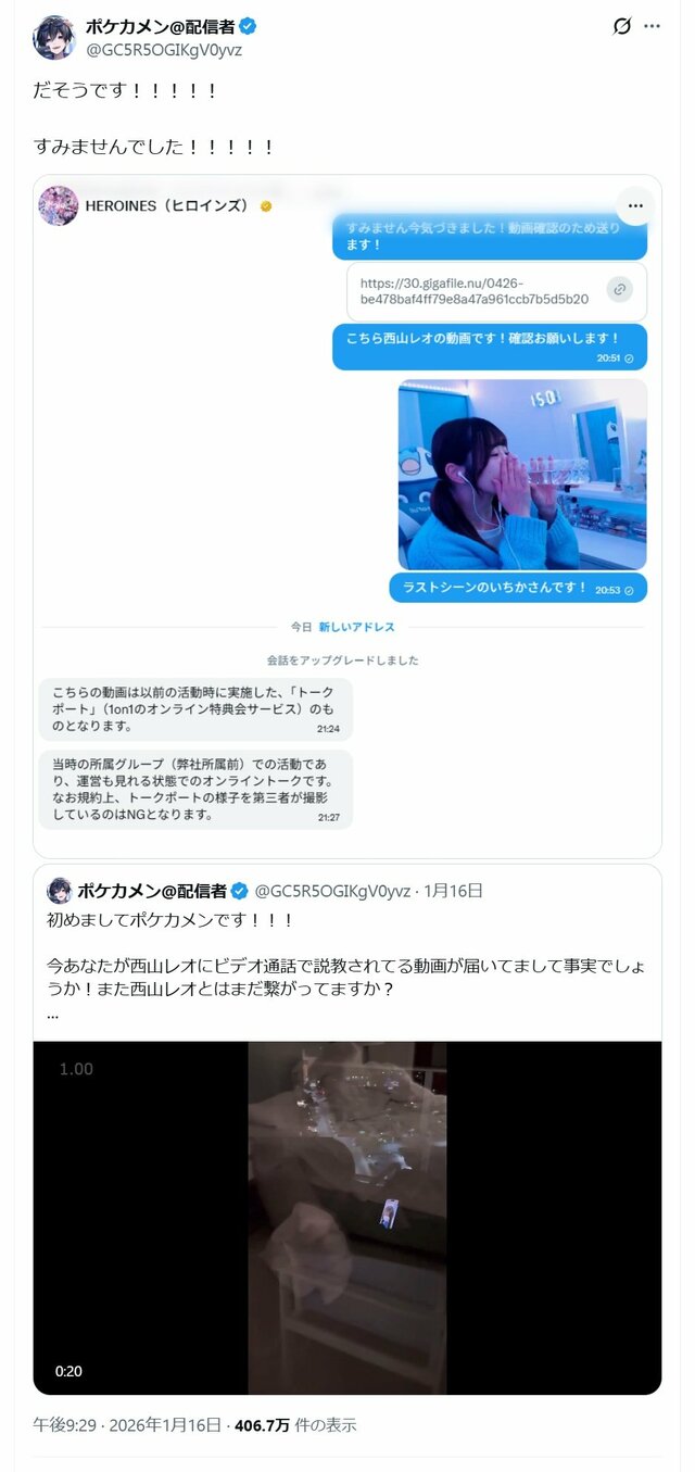 暴露系配信者が“アイドルとファン男性の繋がり”嘘情報発信、事務所激怒で法的措置へ 過去に星野源事務所の前例も ピンズバNEWS編集部 2026.1.22 女性アイドル (3/3ページ) 1ページ目から読む ■【画像】暴露系配信者が公開した「アイドルと男性ファンの繋がり」画像も…直後に“事実誤認と謝罪” アイドルと男性との繋がりを“暴露”しようとしたものの、自爆となってしまった暴露系アカウント「ポケカメン」。 ※画像は「ポケカメン」Xより この画像の記事を読む 1 2 3