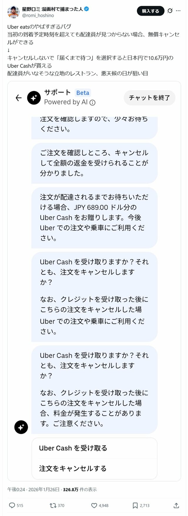 UberEatsの注文トラブルで「商品キャンセルしなければ10.6万円還元」裏ワザを星野ロミが拡散、広報が明かした“真相” ピンズバNEWS編集部 2026.1.28 グルメ (3/3ページ) 1ページ目から読む ■【画像】商品到着を待つと「10.6万円のキャッシュが貰える」UberEatsのやばすぎるバグ画像 利用者も多いことから、システム障害が広く影響を及ぼしたUberEats。公式サポートのXに寄せられる声には朝4時頃の返信もあり、同社が明け方まで対応していたことがわかる。 ※画像は星野ロミ氏のXより この画像の記事を読む 1 2 3