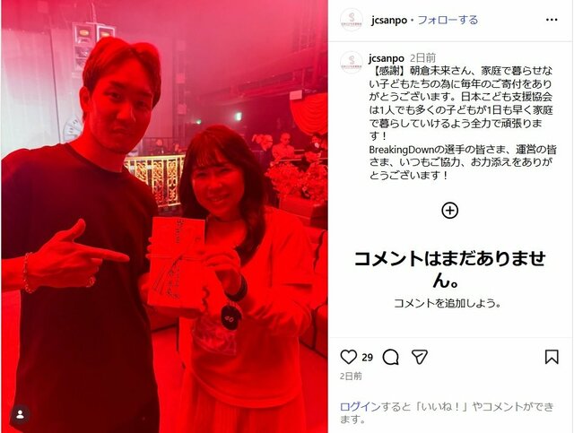 「家庭で暮らせない子どもたちの為に毎年…」朝倉未来が『BreakingDown』の裏で長年続ける寄付活動に称賛集まる ピンズバNEWS編集部 2026.2.4 その他スポーツ (3/3ページ) 1ページ目から読む ■【画像】「かっこいいし尊敬する」朝倉未来が寄付金17万7275円を直接、手渡す姿 25年12月14日に開催された格闘技イベント「BreakingDown18」会場内での募金額17万7275円を『NPO法人日本子ども支援協会』に寄付した朝倉。 ※画像は『NPO法人日本子ども支援協会』公式インスタグラムより この画像の記事を読む 1 2 3