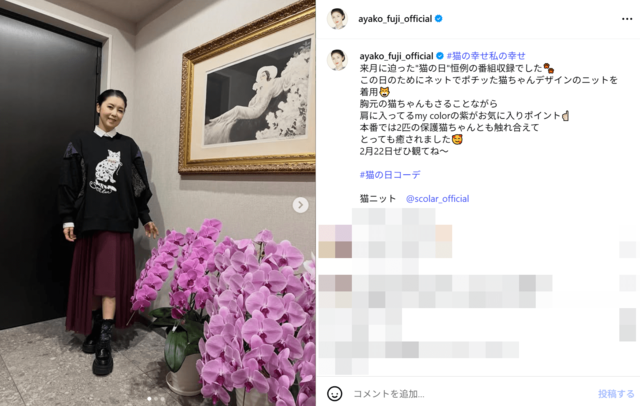 藤あや子・64歳、“ネットでポチった”猫ニット姿がティーンのよう「いつも若々しくて美しい」称賛 ピンズバNEWS編集部 2026.1.28 アーティスト エンタメ (2/2ページ) 1ページ目から読む 【画像】藤あや子・64歳、ティーンのように若々しい“ネットでポチった”猫ニット”姿 《いつも若々しくて美しい》との声も寄せらた藤あや子のまるで少女のような“猫ニット”姿。その年齢を感じさせないおしゃれコーデに《お綺麗なので何でもお似合いです》という声も上がっている。 ※画像は藤あや子のインスタグラムより この画像の記事を読む 1 2