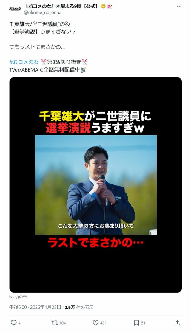 以前の千葉は“かわいい系”男子というイメージだったが、今回のドラマではふっくらフェイスライン、政治家役らしいふてぶてしさというか、貫禄すら感じさせるビジュアル。これにSNSでは、《ぽっちゃりした?》《役作りか》《特殊メイクしてるの!?ってレベル》とザワつく視聴者が続出している。