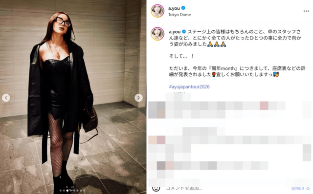浜崎あゆみは30日までにインスタグラムを更新。黒レザーのボディスーツ姿で米歌手のレディー・ガガの来日公演を楽しんだことを報告。《いつもと違う雰囲気で素敵》《ファッションとメイクが強めのあゆやっぱ好きすぎる》《ブラックあゆちゃんセクシーで綺麗すぎるーーーー日に日に綺麗になってて美のエンターテイナーですね》《可愛すぎる!姐さん!》とフォロワーから絶賛されていた。
