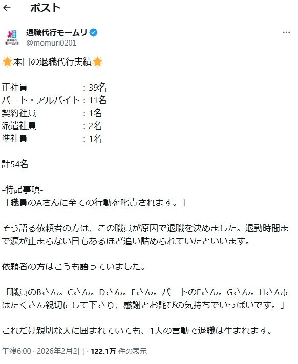 【代表と妻が逮捕】『退職代行モームリ』当局が許さなかった超悪徳商法と逮捕を察知か不可解な引越し ピンズバNEWS編集部 2026.2.4 事件 (3/3ページ) 1ページ目から読む ■【画像】『退職代行モームリ』【代表と妻が逮捕】前日“驚き”の利用者数 『退職代行業者『モームリ』が摘発されたのは2月3日。その1日前の利用者数は合計54名だった。 ※画像は『退職代行モームリ』の公式Xより 【この画像の記事を読む】 1 2 3