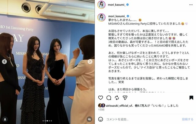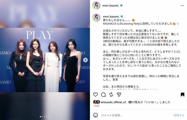 元テレビ東京アナウンサーでタレントの森香澄(30)が2月7日、インスタグラムを更新。人気ガールズグループTWICEのミナ、サナ、モモの3人で結成されたユニットMISAMOとの4ショットを公開すると、フォロワーからは《めちゃくちゃ美女が揃ったなぁ!!》《ミサモより顔小さいの?》といったコメントが寄せられた。
