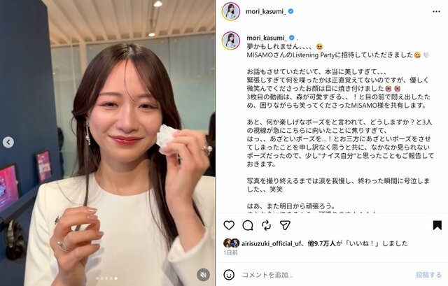 ■【画像】「スタイル良すぎ」森香澄がお腹チラリの“穴あき衣装”姿を公開、憧れのアイドルとの対面で号泣も…