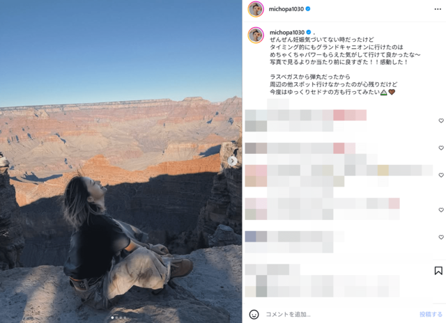 「次はベビーちゃんと一緒ですね」第1子妊娠のみちょぱ、“妊娠気づいてない時”弾丸海外の絶景ショットに反響 ピンズバNEWS編集部 2026.2.12 エンタメ (2/2ページ) 1ページ目から読む ■【画像】「次はベビーちゃんと一緒ですね」第1子妊娠のみちょぱ、“妊娠気づいてない時”弾丸海外の絶景ショット グランドキャニオンを訪れたのは《妊娠気づいてない時》だったというが、ファンからは《次はベビーちゃんと一緒ですね》というコメントも。無事に出産し、親子ショットを公開してくれる日が待ち遠しい。 ※画像はみちょぱのインスタグラムより この画像の記事を読む 1 2