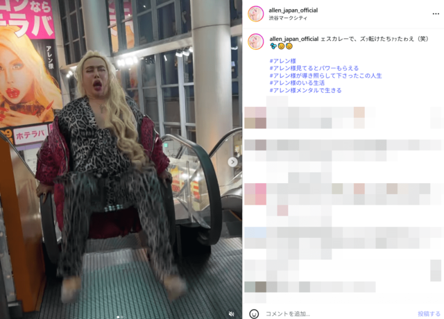 「危ない」‟整形総額1億円超”アレン様、渋谷・エスカレーターでの“おふざけ転倒動画”に心配の声も ピンズバNEWS編集部 2026.2.13 エンタメ (2/2ページ) 1ページ目から読む ■【画像】「危ない」アレン様、心配の声が上がったエスカレーターで“おふざけ転倒動画” アレン様が公開したエスカレーターでのおふざけ動画には《危ない》といった反応も。ユーモアたっぷりの動画からアレンのサービス精神が伝わってくるが、まずは安全第一だ。 ※画像はアレン様のインスタグラムより、以下同 この投稿をInstagramで見る ⚜️✨🌹アレン様 ALLEN🌹✨⚜️(@allen_japan_official)がシェアした投稿 この画像の記事を読む 1 2