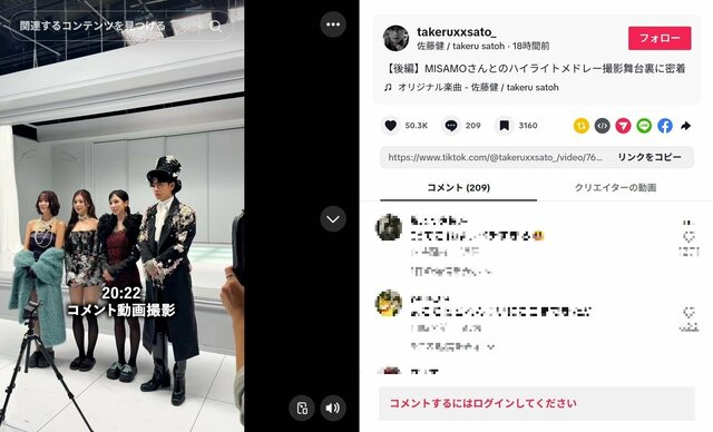 俳優の佐藤健(36)が2月11日、TikTokを更新し、人気ガールズグループTWICEのミナ、サナ、モモの3人で結成されたユニットMISAMOとのメイキング動画の舞台裏を公開した。とりわけ、ファンの視線は彼女たちとの身長差に集中し、《シークレットブーツ履いてる?》《10センチくらい盛ってるのかな?身長差が良い感じ》といったコメントが寄せられた。