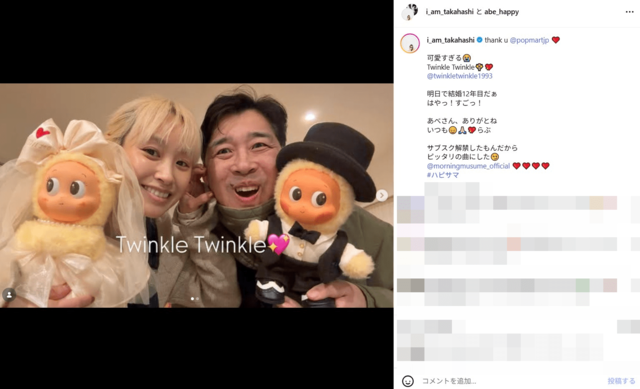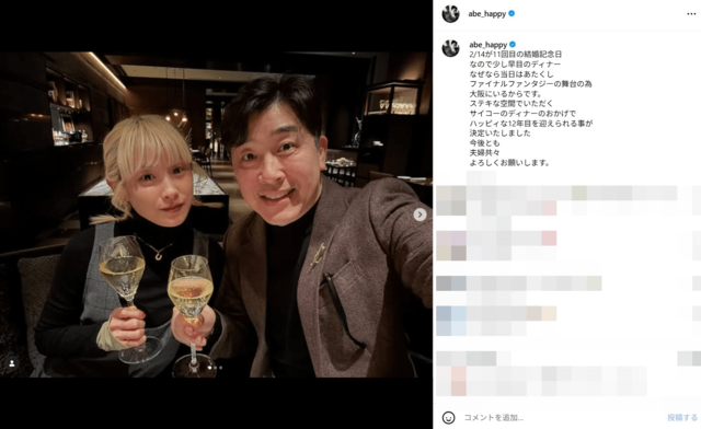 「めちゃ若い」近影が話題の高橋愛&あべこうじ、11回目の結婚記念日ショット公開 “11歳差”おしどり夫婦が沸騰 ピンズバNEWS編集部 2026.2.14 エンタメ (2/2ページ) 1ページ目から読む ■【画像】「めちゃ若い」近影も話題の高橋愛&あべこうじ、11回目の結婚記念日ショット 《めちゃ若い》と近影も話題の11歳年下妻・高橋愛との11回目の結婚記念日ショットを公開したあべこうじ。相思相愛な2人のおしどり夫婦道はこれからも続きそうだ。 ※画像はあべこうじのインスタグラムより、以下同 この画像の記事を読む 1 2