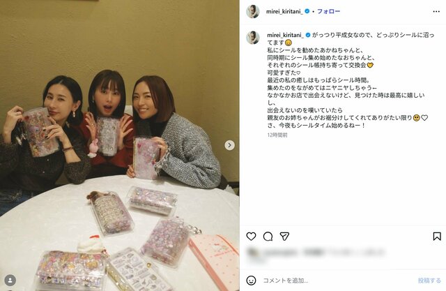 桐谷美玲がインスタグラムを更新。《がっつり平成女なので、どっぷりシールに沼ってます》と明かし、アパレル社長の黒石奈央子氏、モデルでヨガインストラクターの里見茜氏とシール交換会を楽しんだと報告した。