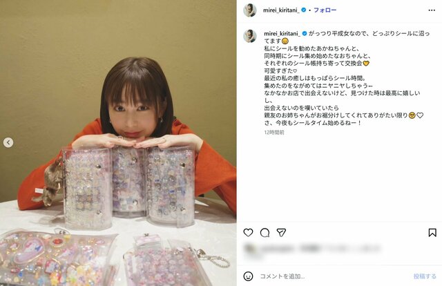 シール帳にあごを乗せて笑顔を浮かべる桐谷の姿には《シールより真ん中の女性が一番レート高いです かわいすぎる!》《2枚目の写真シール帳を並べて顎に乗せてる姿が可愛すぎる》といった声が寄せられた。