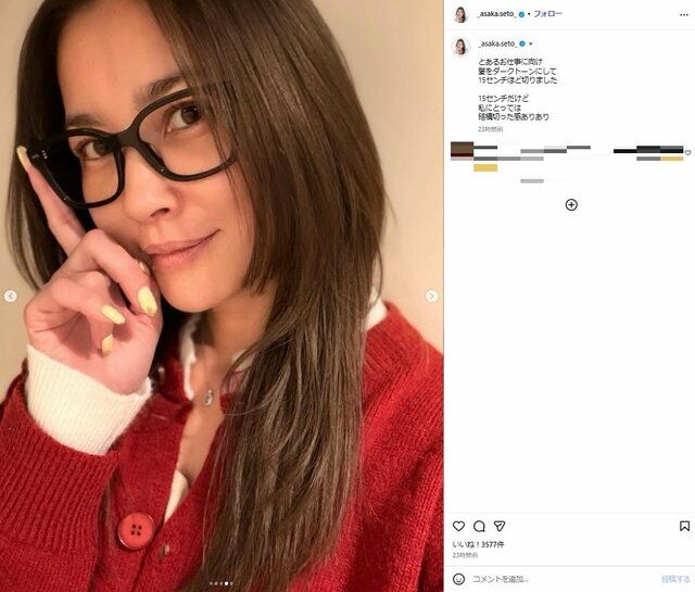 15日の投稿で《ハイトーンカラー見納め 笑 今度はいつできるかわからないから写真に納めてて良かった》とヘアチェンジを予告していた瀬戸は、落ち着いたダークブラウンのニューヘアを披露した。