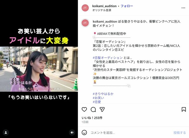 女性お笑いカルテット『ぼる塾』のきりやはるか(31)が2月18日、インスタグラムを更新し、ABEMAの『恋髪オーディション』#2に出演したことを報告。番組の企画で大胆イメチェンした姿を公開すると、ファンからは《お似合いすぎます》《元々かわいいけど更にかわいくなったよ》といったコメントが寄せられた。
