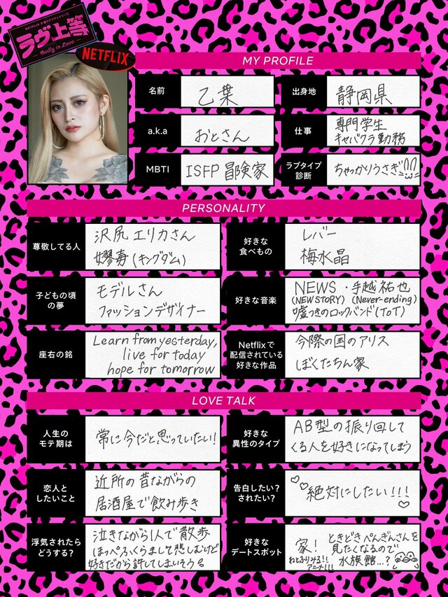 ■【画像】『ラヴ上等』出演の美人キャバ嬢、肩出しトップスからびっしりタトゥー 直筆プロフの“美文字”も話題