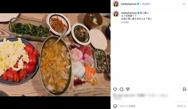 藤本美貴がトレーに入ったままの刺身を食卓に並べた画像をアップ。《いつも美味しそうです そして我が家も移し替えません笑笑》《私もお刺身はパックで移し替えない民です》と共感を呼んでいる。また、飯島直子も割引シールが張られたおにぎりやトレーに入った惣菜と飾らない食卓を公開している。